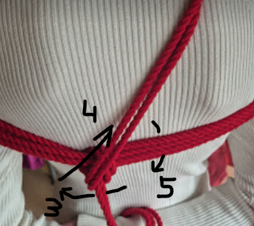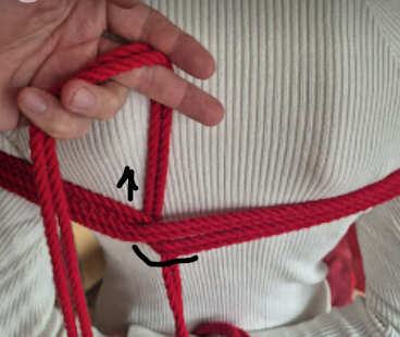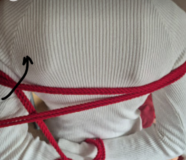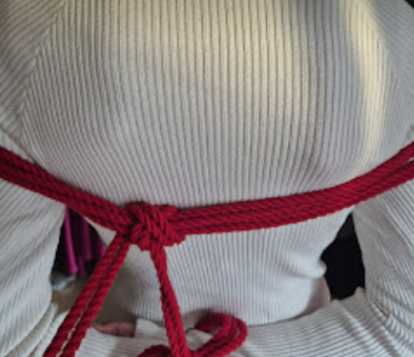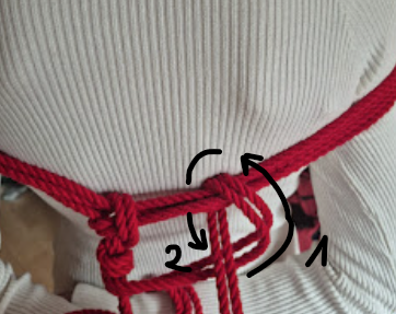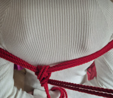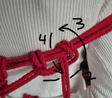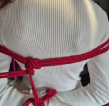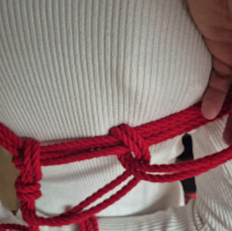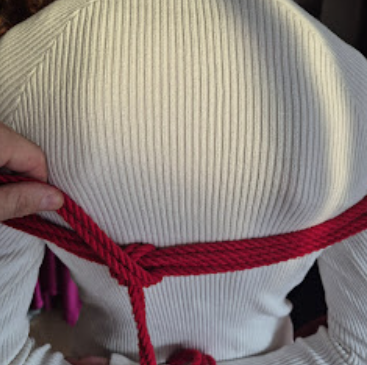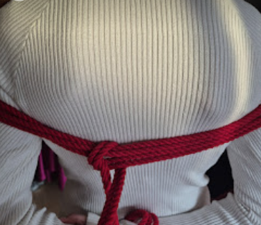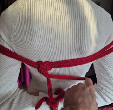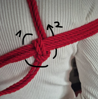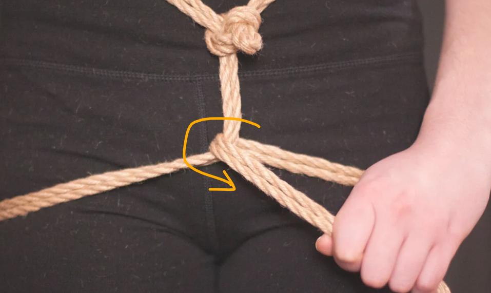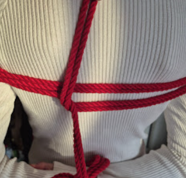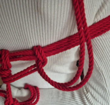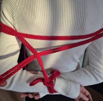 Het touw kruist zichzelf in tegengestelde richtingen. Die kruisende krachten maken de X-frictie bijzonder stevig. Dit is een klassieke, breed toepasbare borgvorm in shibari, en een van de meest voorkomende in harnasen.